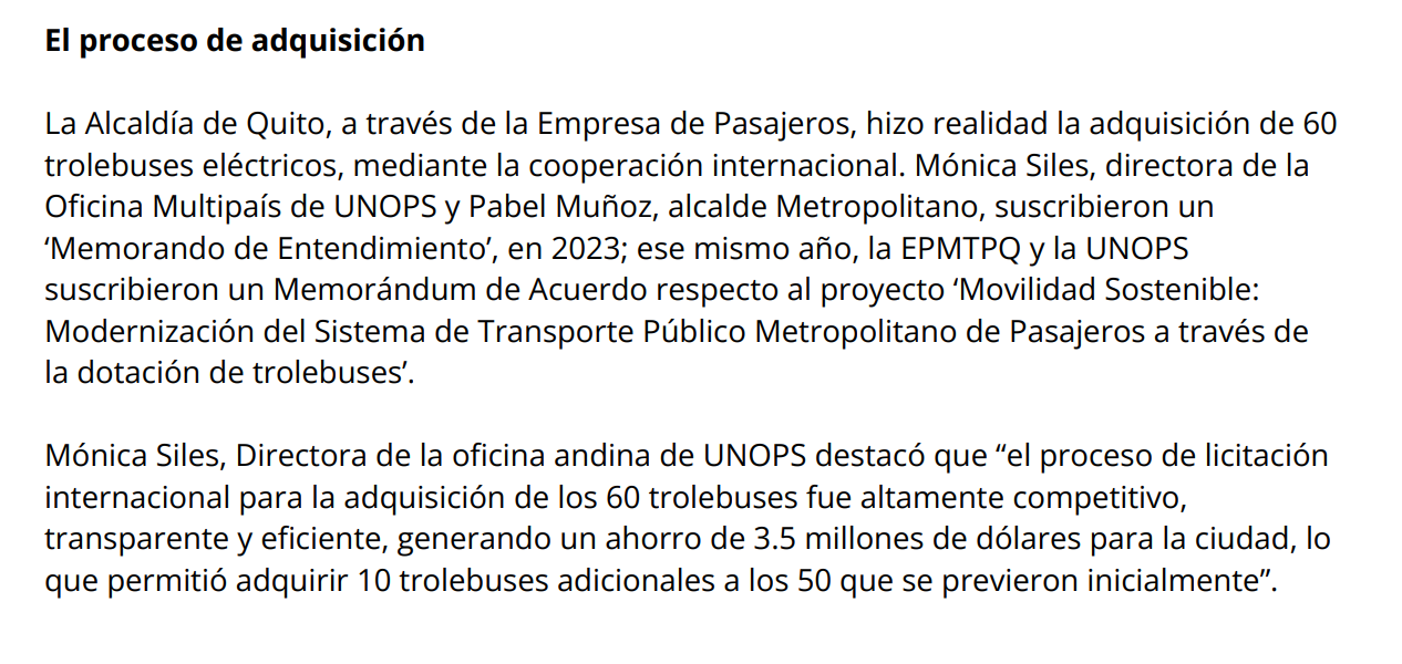 El Alcalde de Quito indica que esta contratación se realizó con el apoyo de la Oficina de las Naciones Unidas de Servicios para Proyectos (UNOPS) es un organismo operativo de la ONU especializado en infraestructura, adquisiciones y gestión de proyectos. Su objetivo es apoyar a gobiernos e instituciones a implementar proyectos sostenibles y eficientes, con un fuerte enfoque en transparencia y rendición de cuentas.